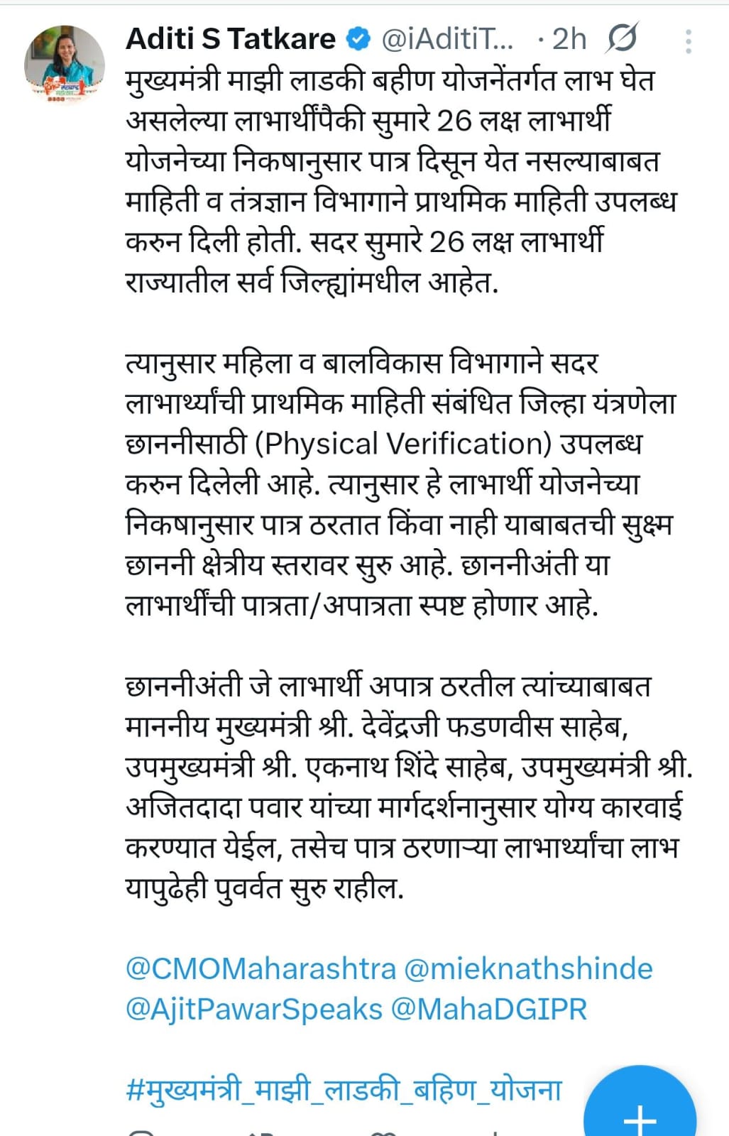 ही माहिती मंत्री आदिती तटकरे यांनी त्यांच्या ट्विटर अकाउंटवरून दिली आहे. या निर्णयामुळे योजनेचा उद्देश अधिक स्पष्ट होत आहे आणि भविष्यात या योजनेचा लाभ योग्य व्यक्तींपर्यंतच पोहोचेल अशी आशा आहे. ही संपूर्ण प्रक्रिया योजनेतील पारदर्शकता वाढवण्यासाठी उचललेलं एक महत्त्वाचं पाऊल आहे.